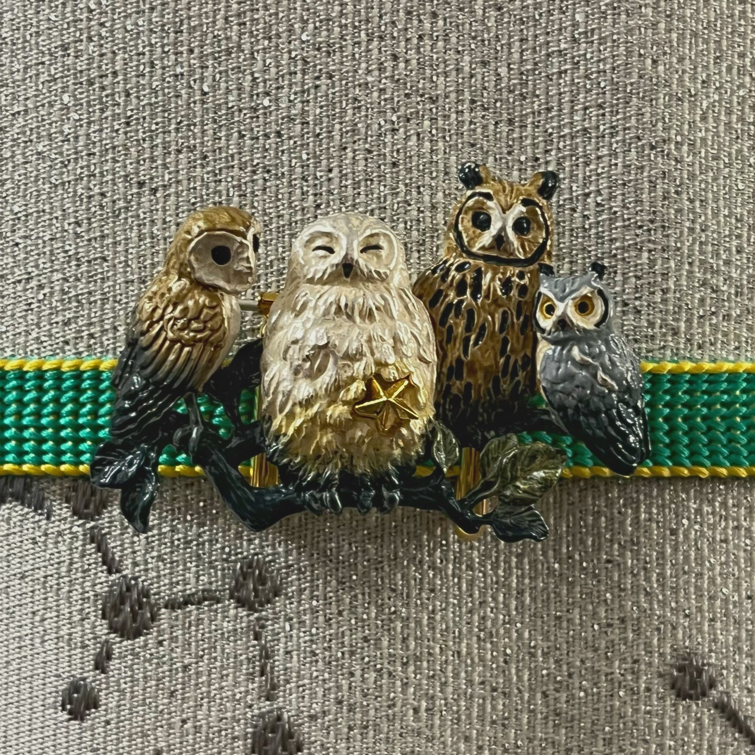 ミルクティーカラー、スモーキーブルー、青錆色、淡いレモン色で彩色された枝にとまる4羽のフクロウと金色の星がデザインされています。