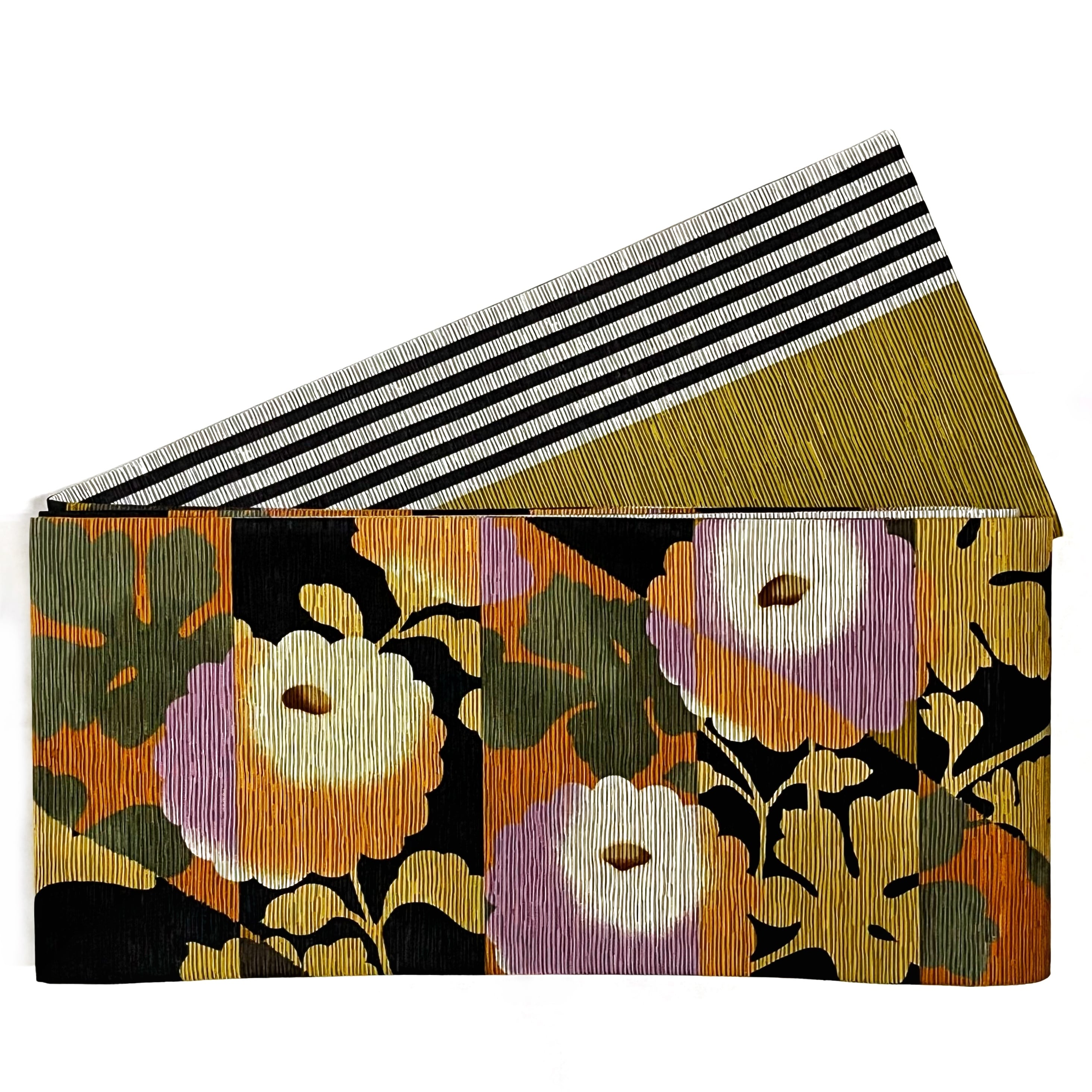 やや緑みのからし色に、黒×ライトグレーのストライプ模様です。