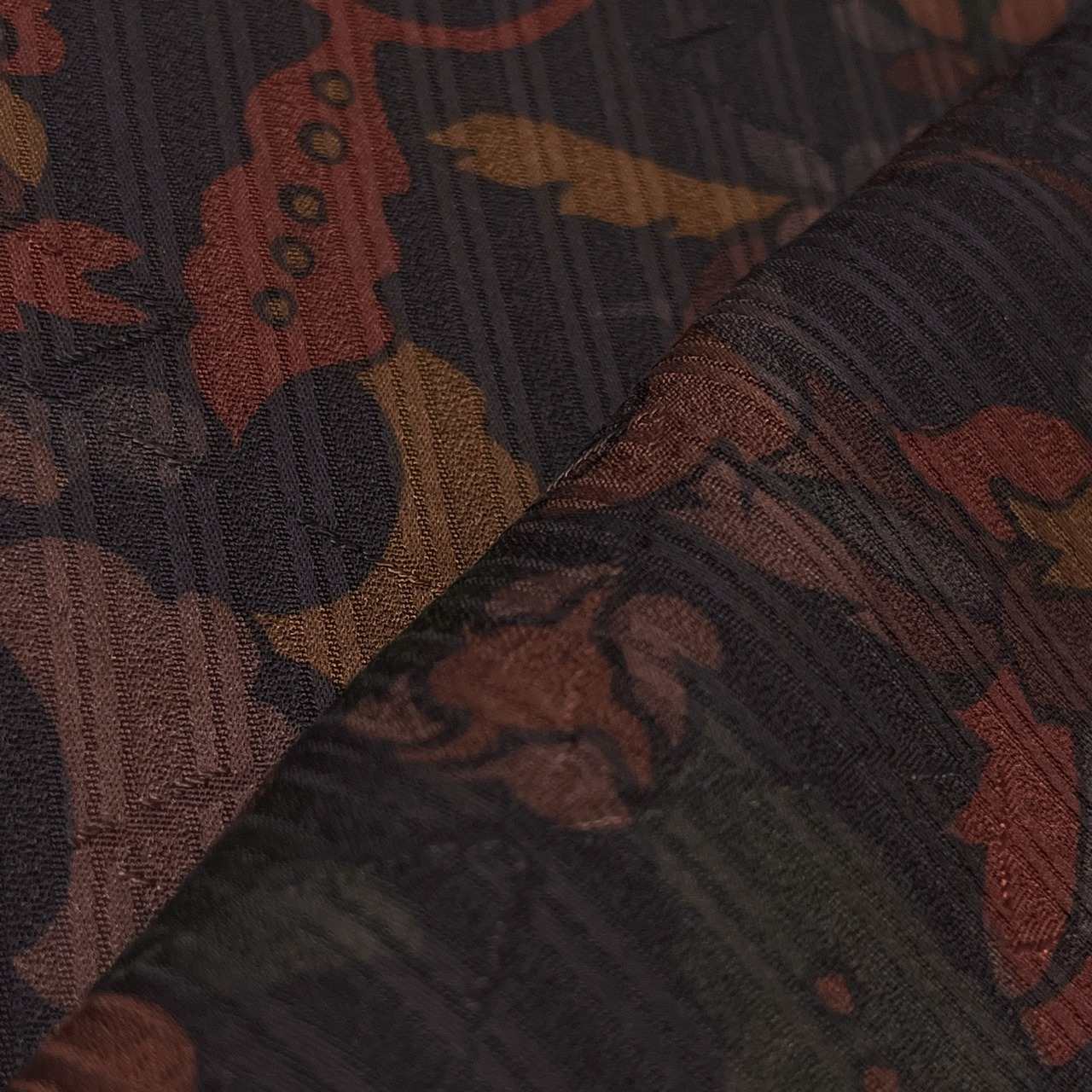 ・色柄説明:ストライプと松皮菱文様の地紋が入った、やや紫色帯びた深いビターチョコレート色の地に