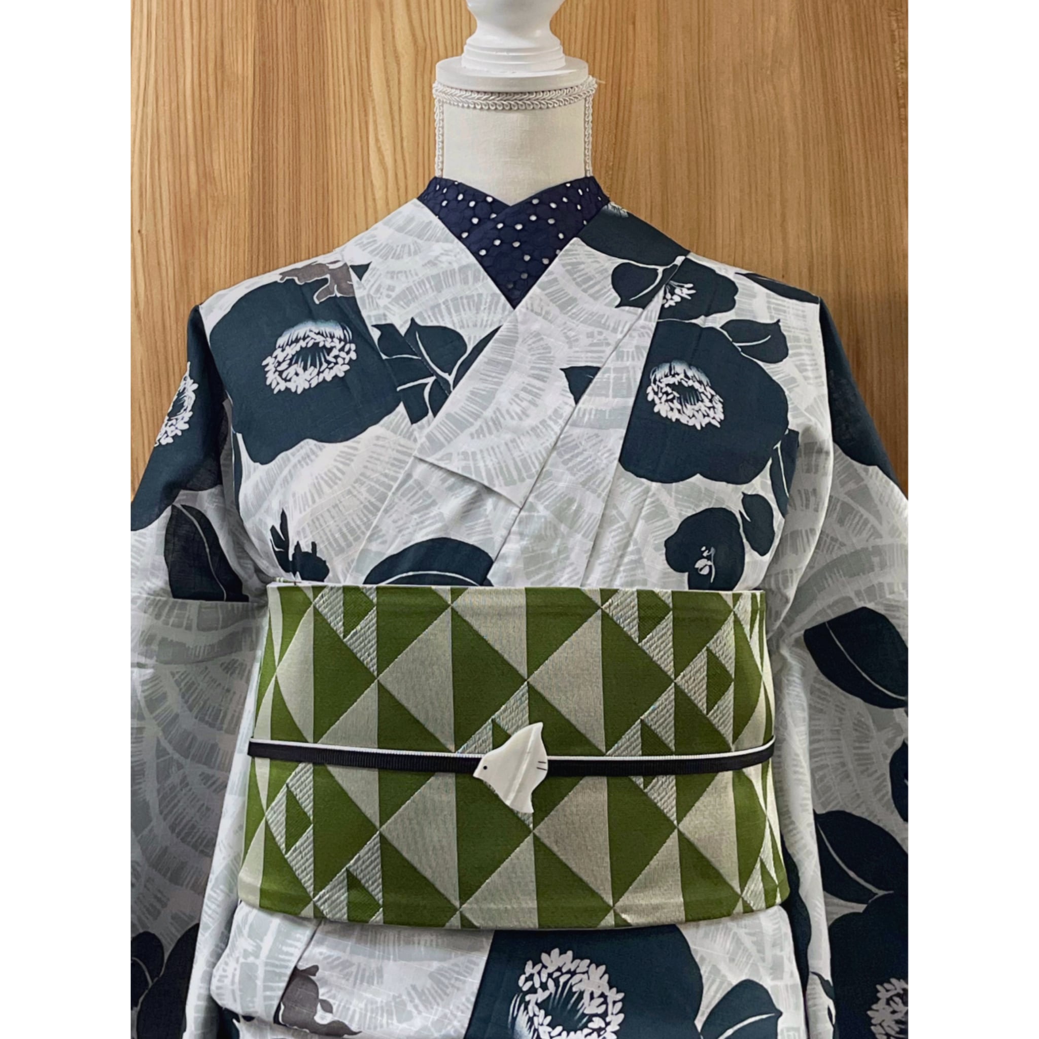商品名:「アイビーグリーン×シルバーの鱗文様リバーシブル半幅帯」