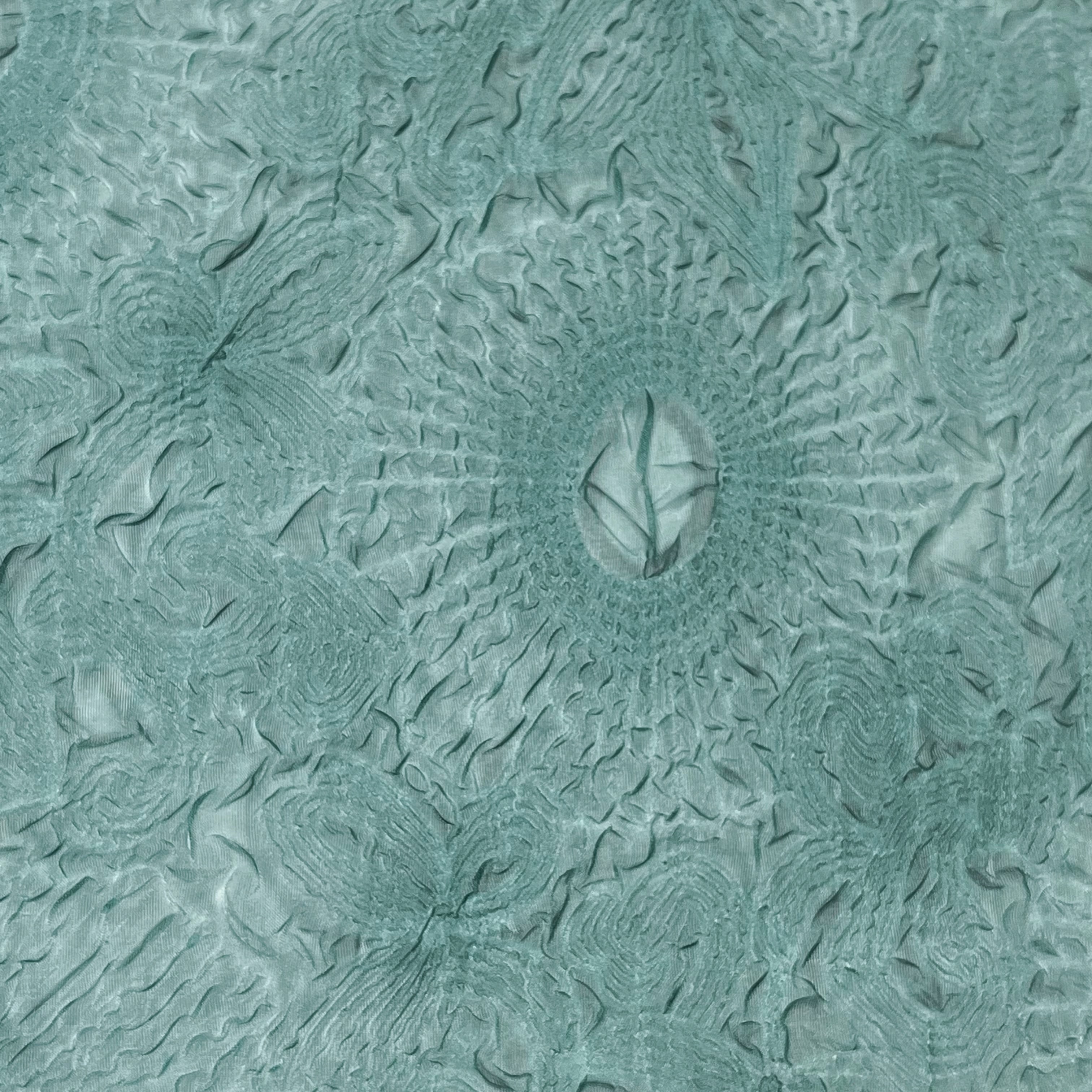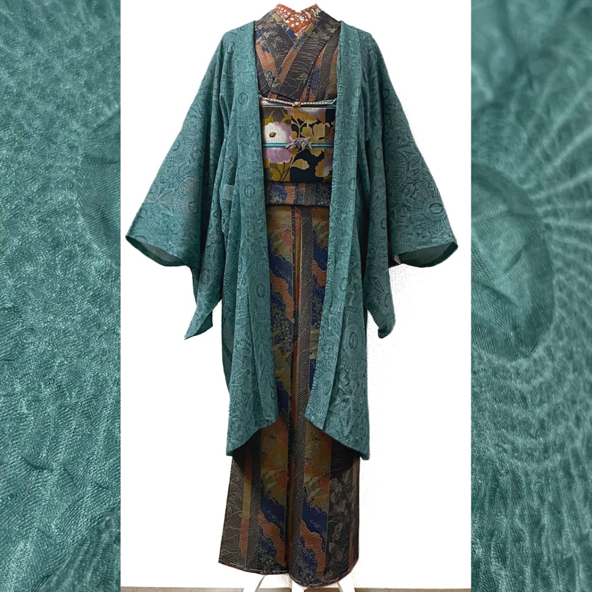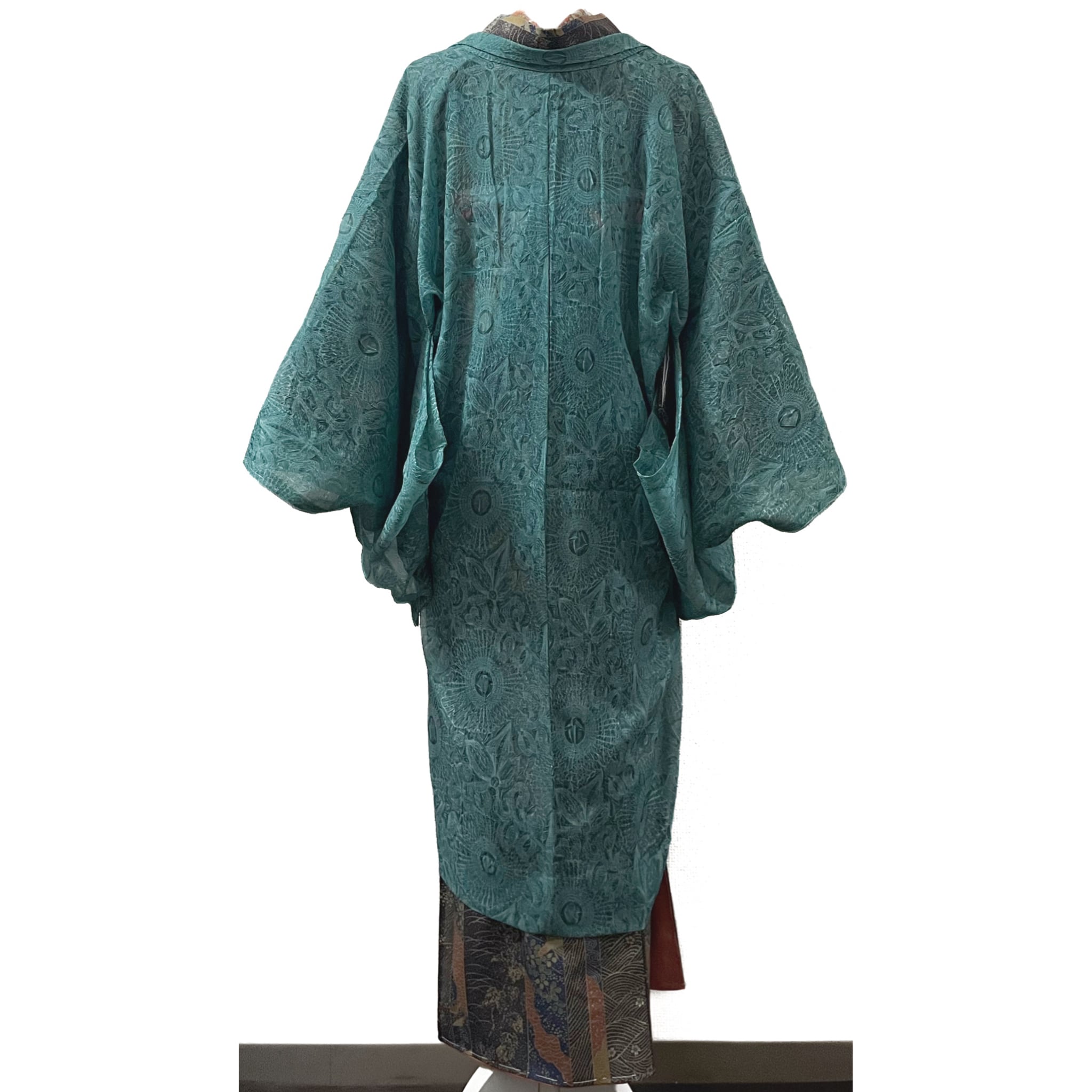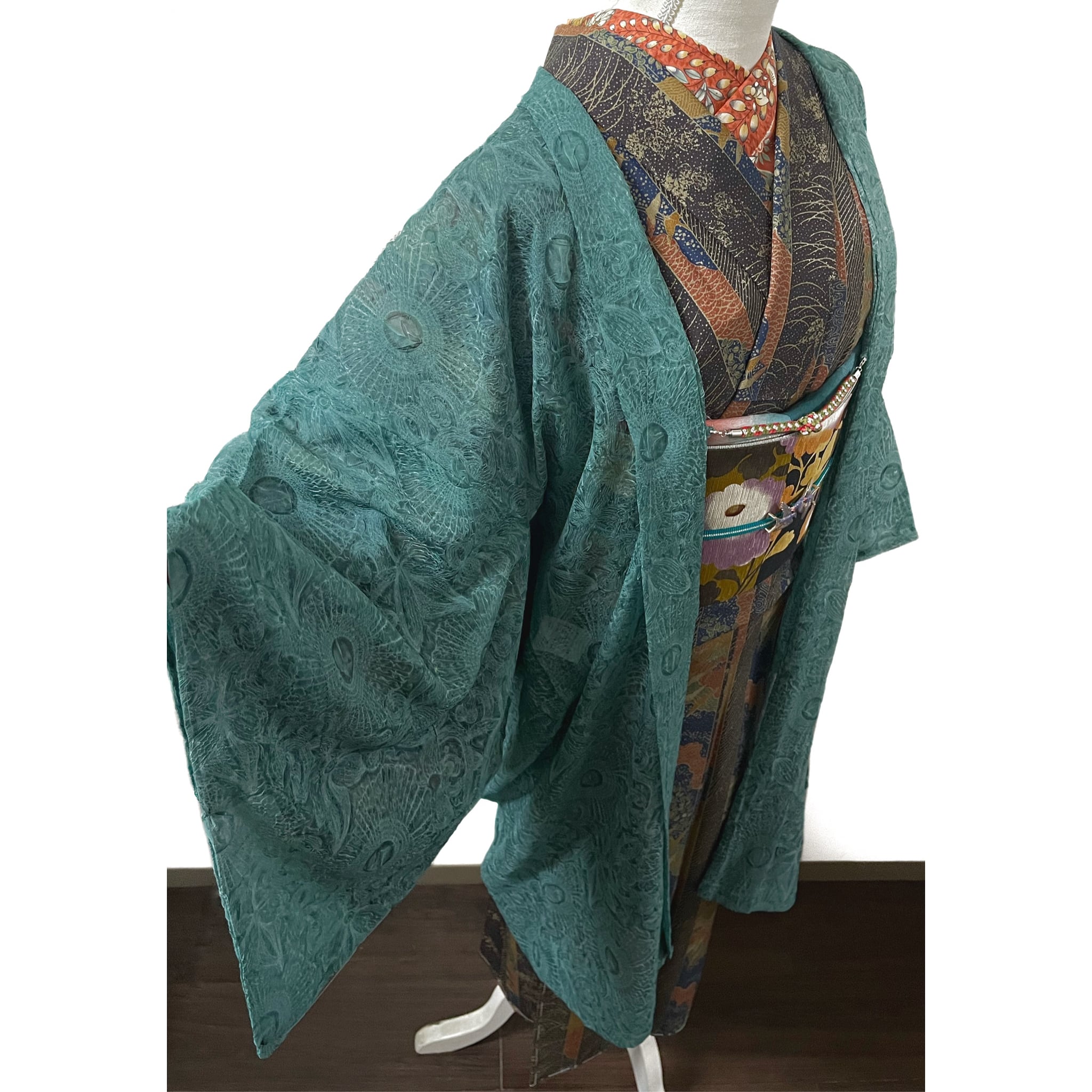 ・色柄説明:しっかりとしたしぼで表現されたアラベスク模様が美しい、青碧色(せいへき色:鈍い青緑色)のオーガンジー素材の薄羽織です☺︎