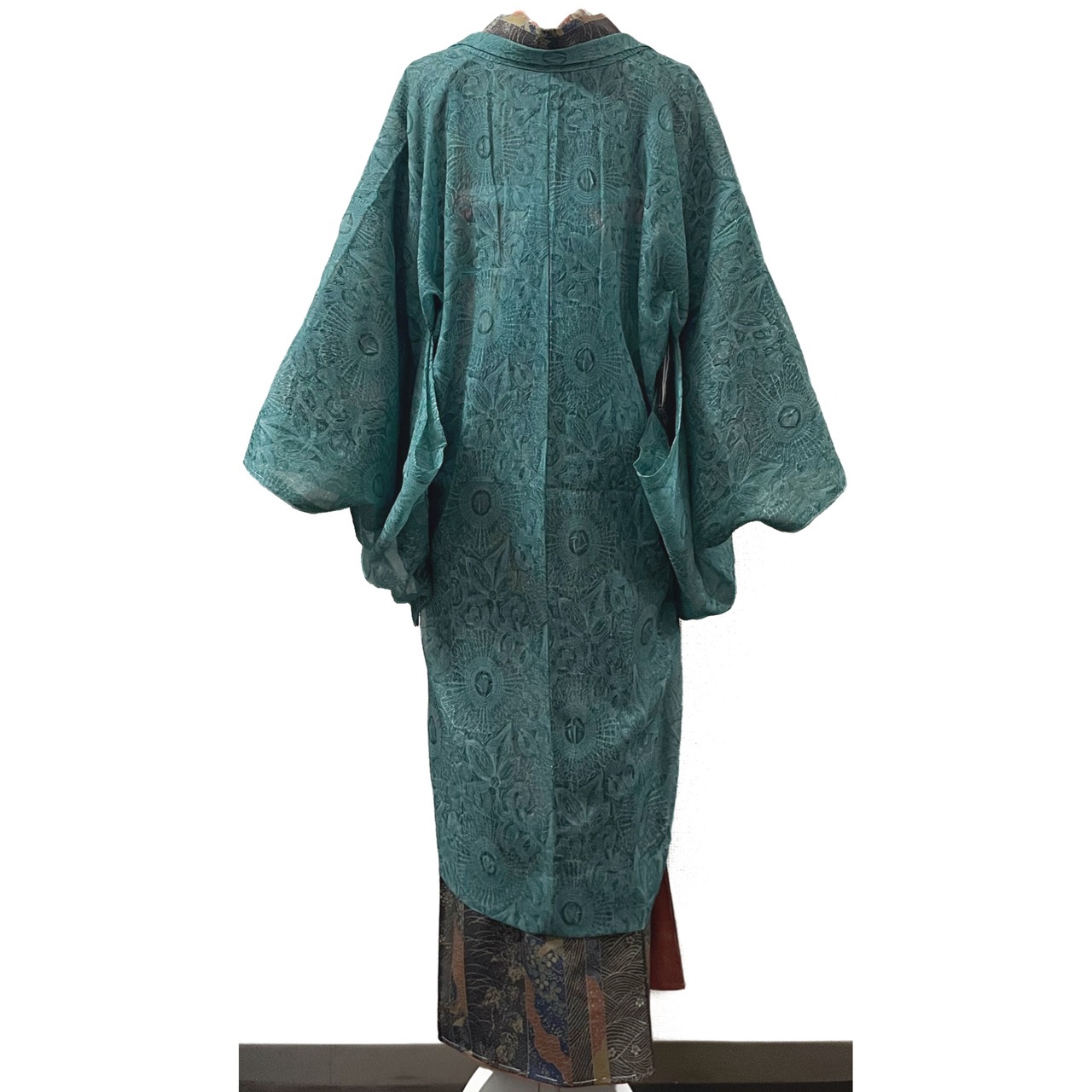 【新品】単衣仕立てのアラベスク模様オーガンジー羽織り(青碧色)