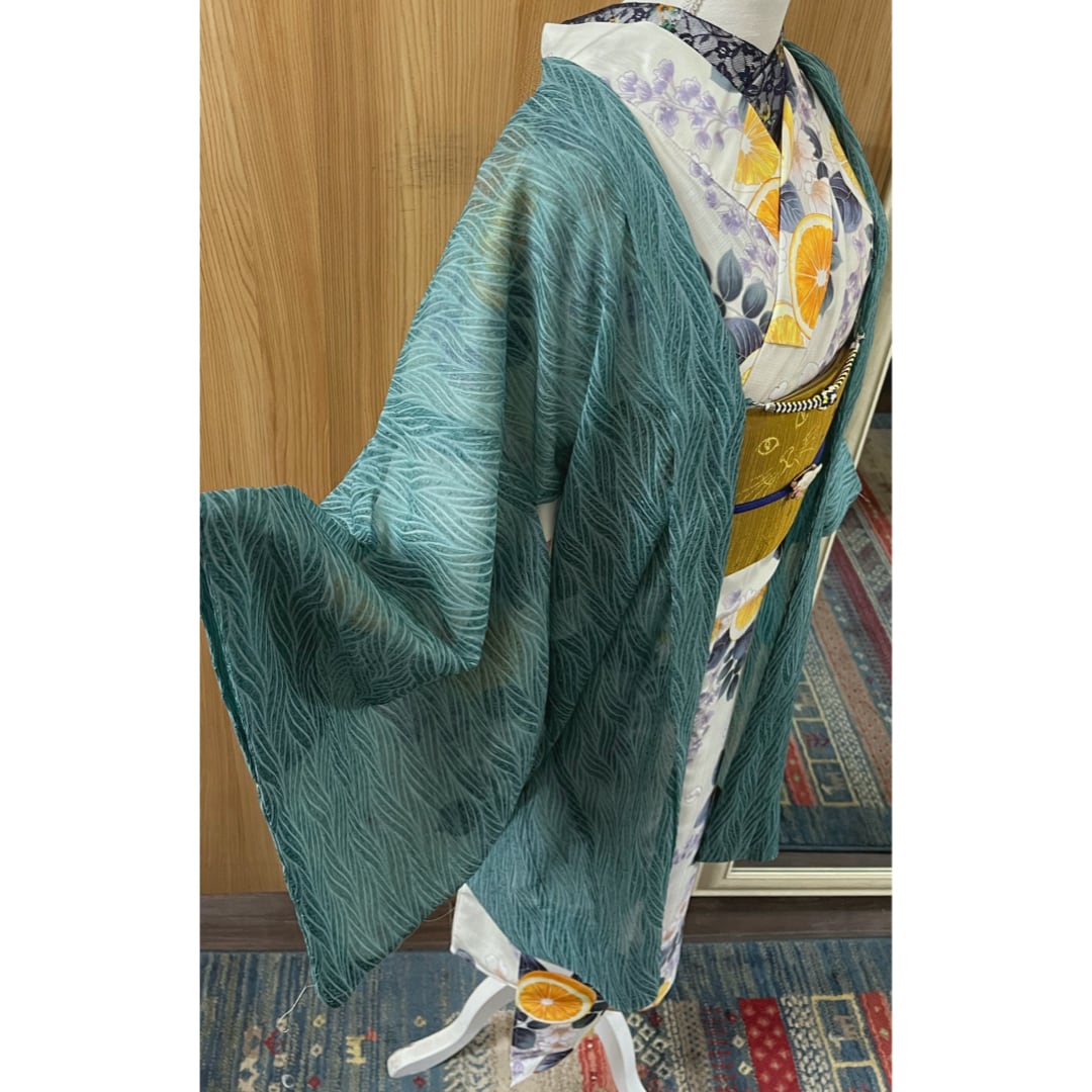 【新品】単衣仕立てのリーフ模様オーガンジー羽織り(青碧色)