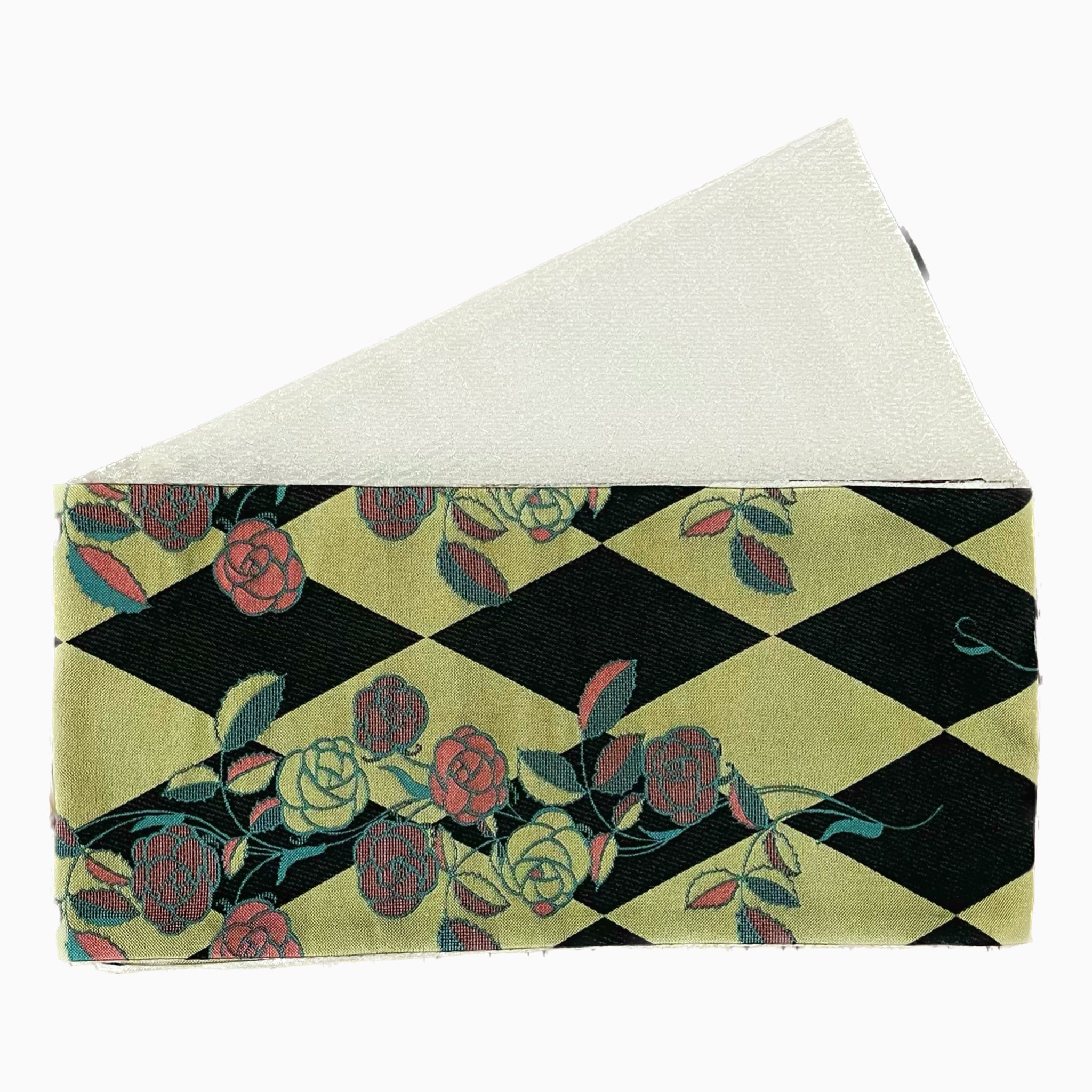 商品名:「おりびと ダイヤ柄×薔薇模様のリバーシブル半幅帯(黒色)」