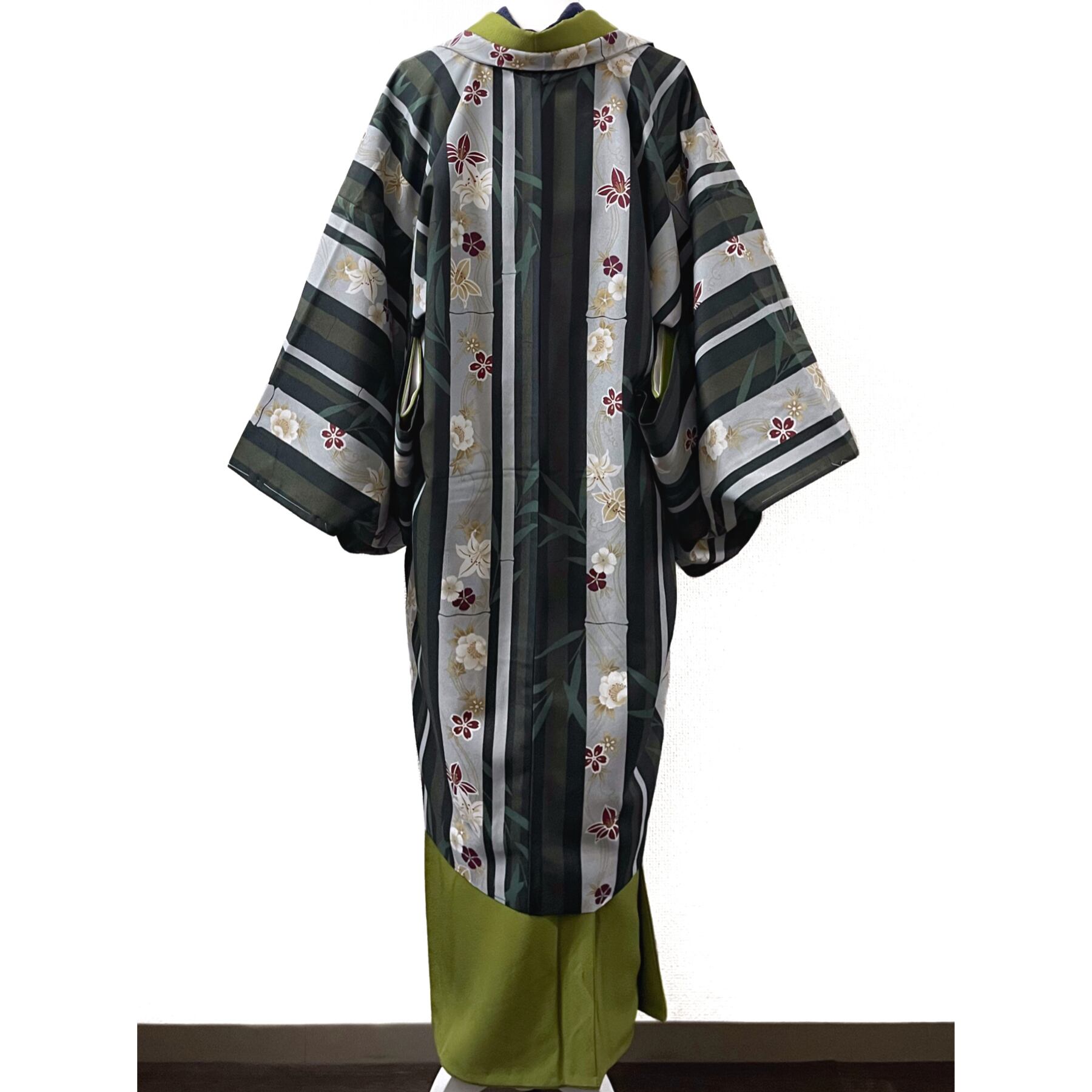 【新品】暗緑色に竹縞と流水花文様の洗える長羽織り