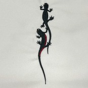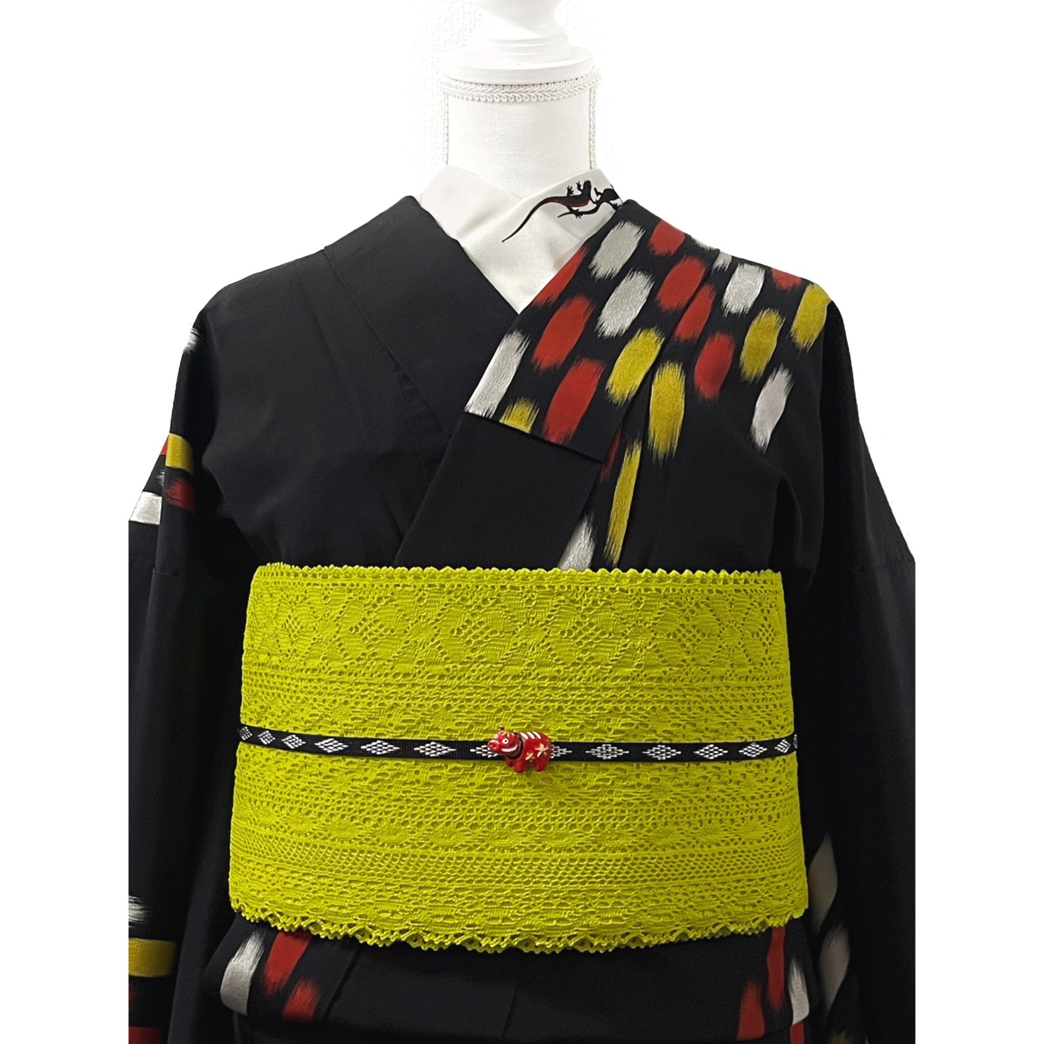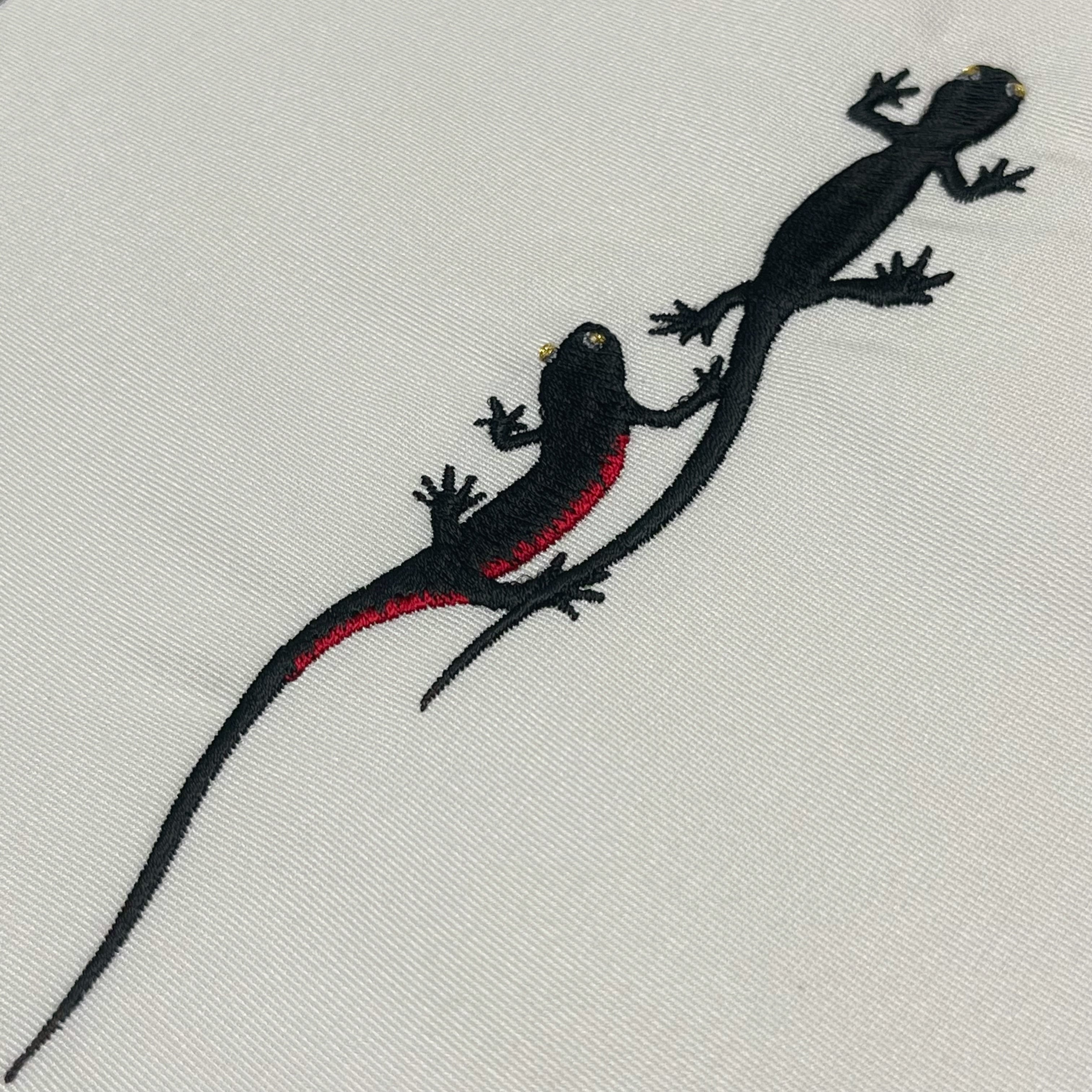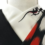 左前のみに黒色のボディに赤色のお腹、銀色の瞳のイモリが刺繍された半衿です☺︎