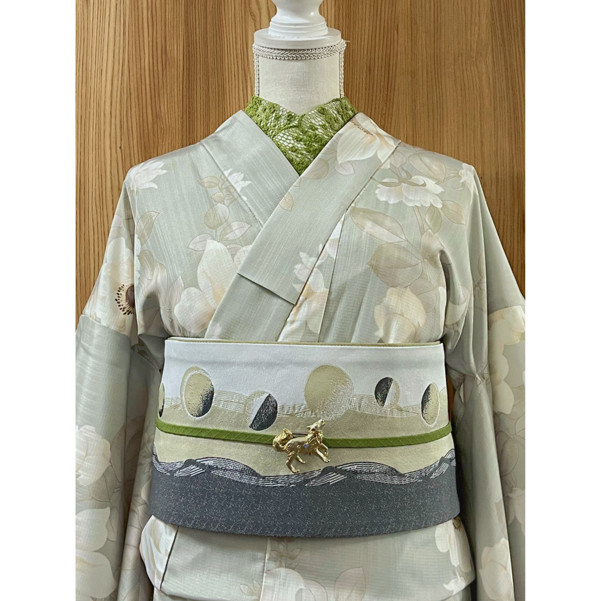 ・色柄説明:格子柄の織柄が入った灰黄緑色(灰色がかった黄緑色)な地に