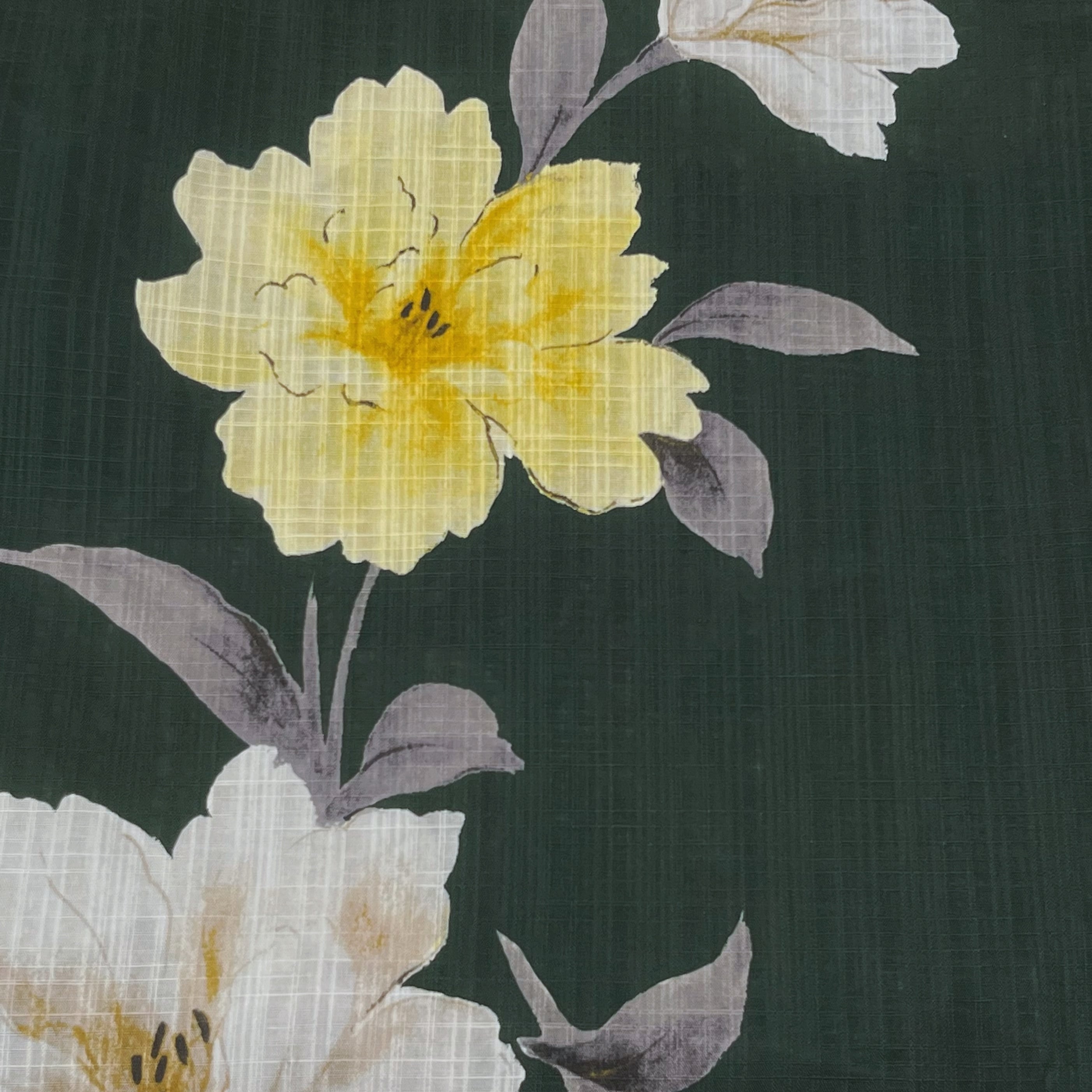 【新品】格子織柄入り 御納戸茶色に花模様の綿浴衣