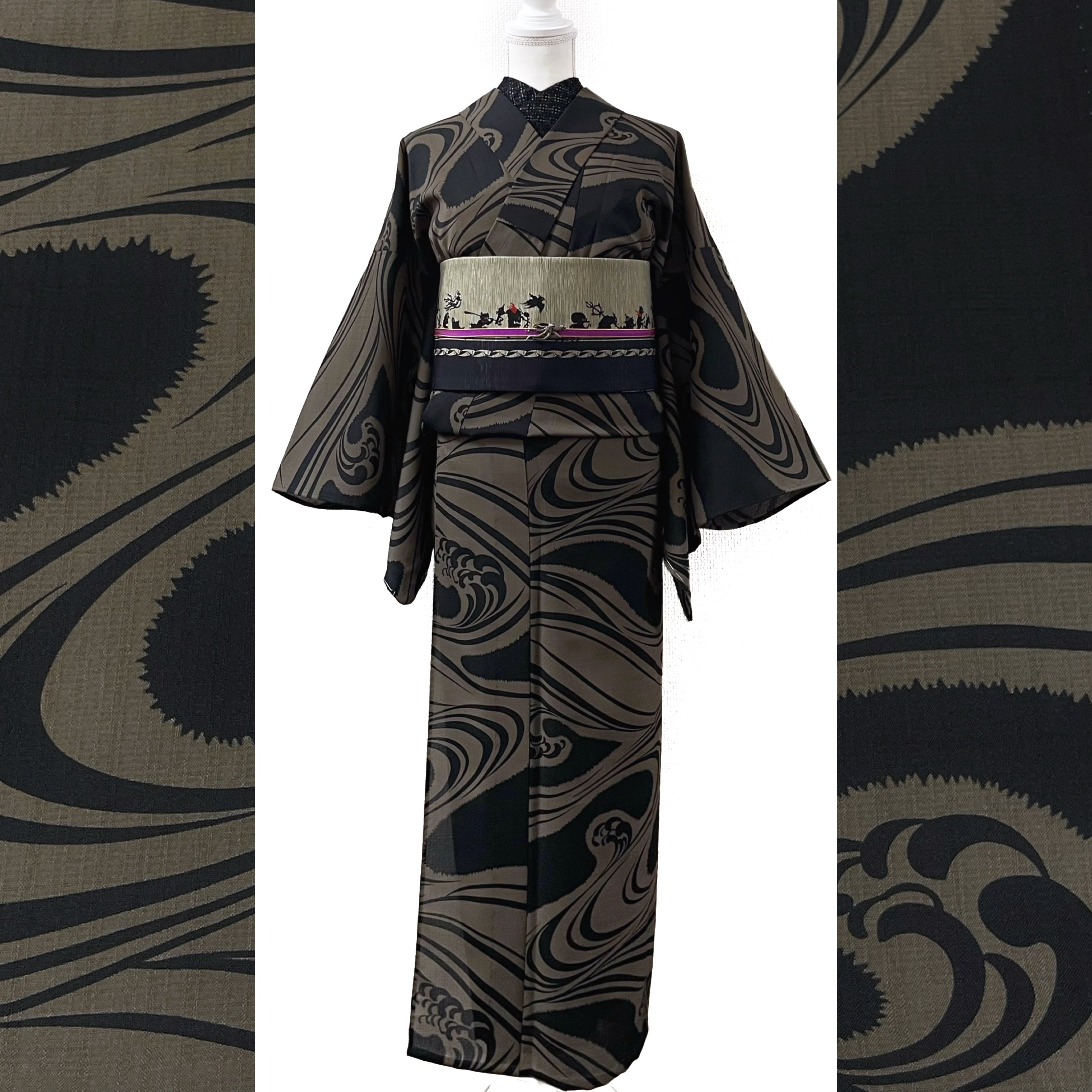 墨黒とグレージュの流水荒波文様がデザインされた、粋で格好良い一枚です☺︎