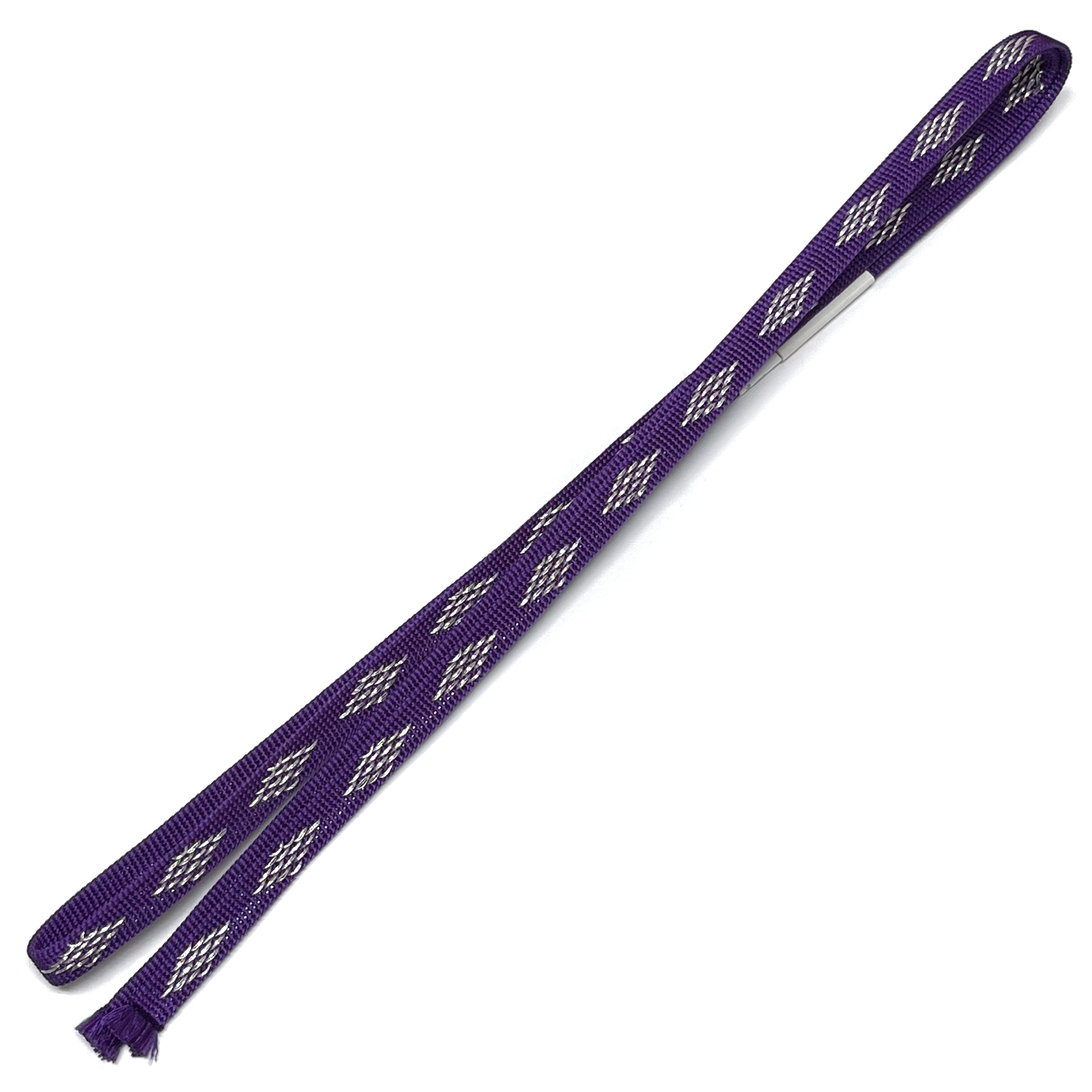 色柄説明:江戸紫色(青みを帯びた紫)に銀色のダイヤ柄が織り込まれたの三分紐です。