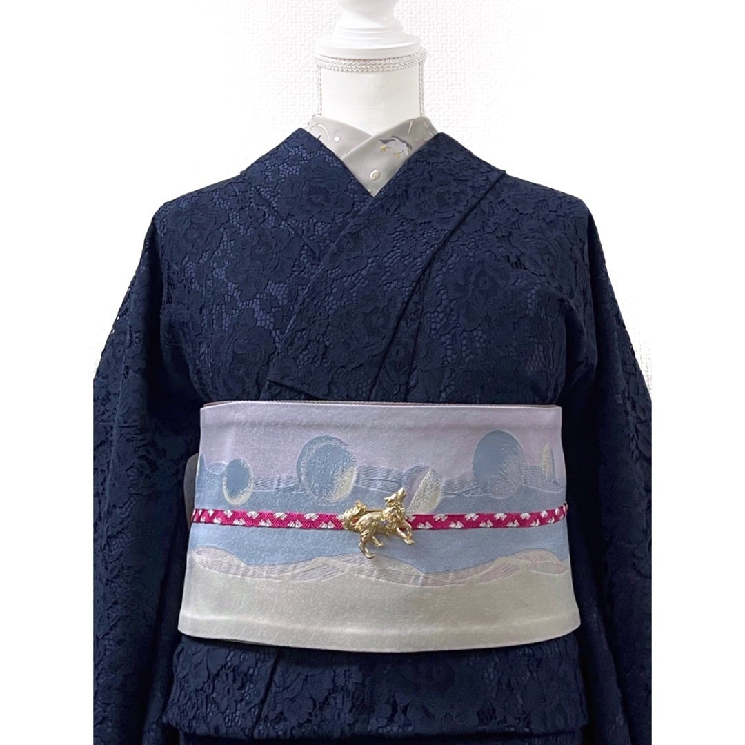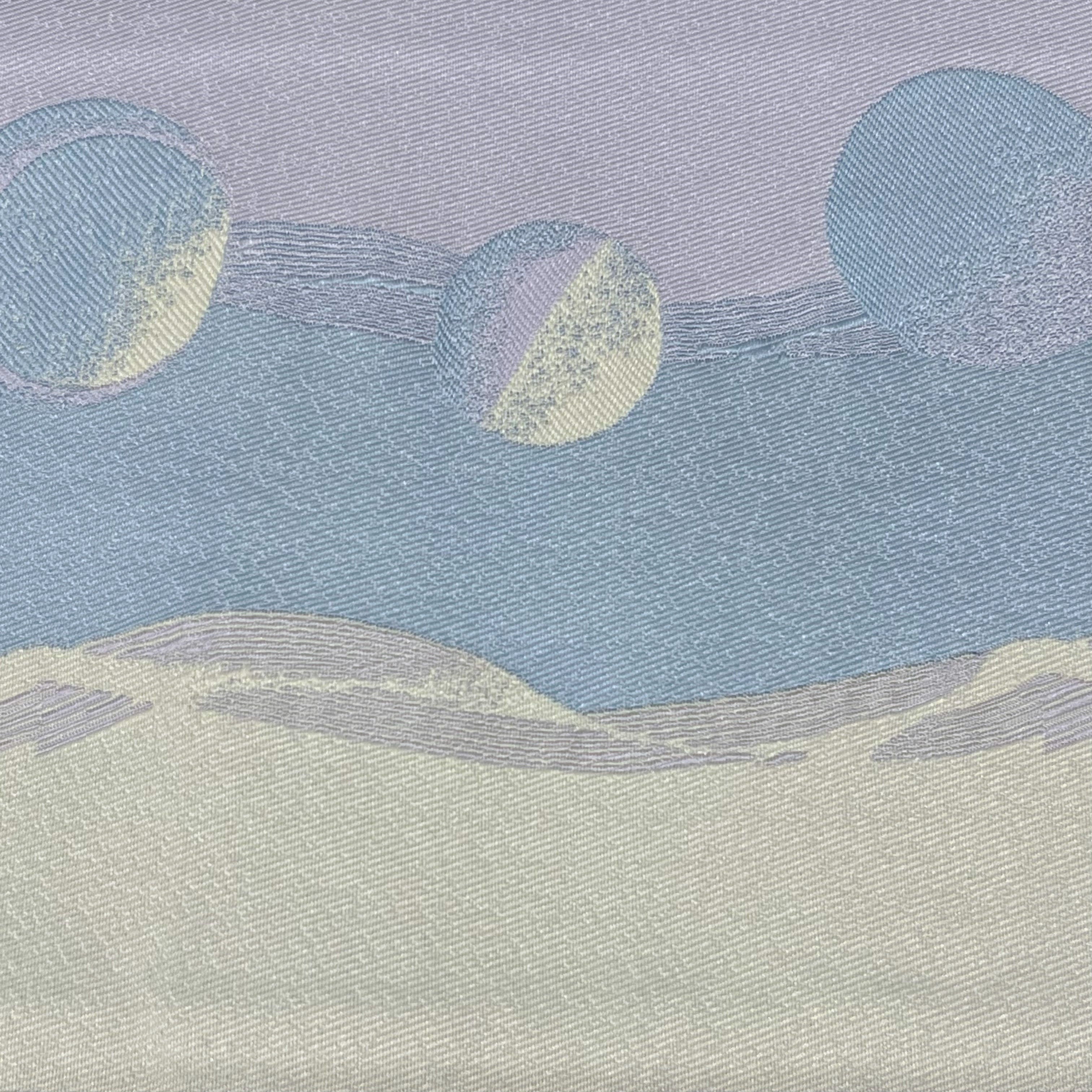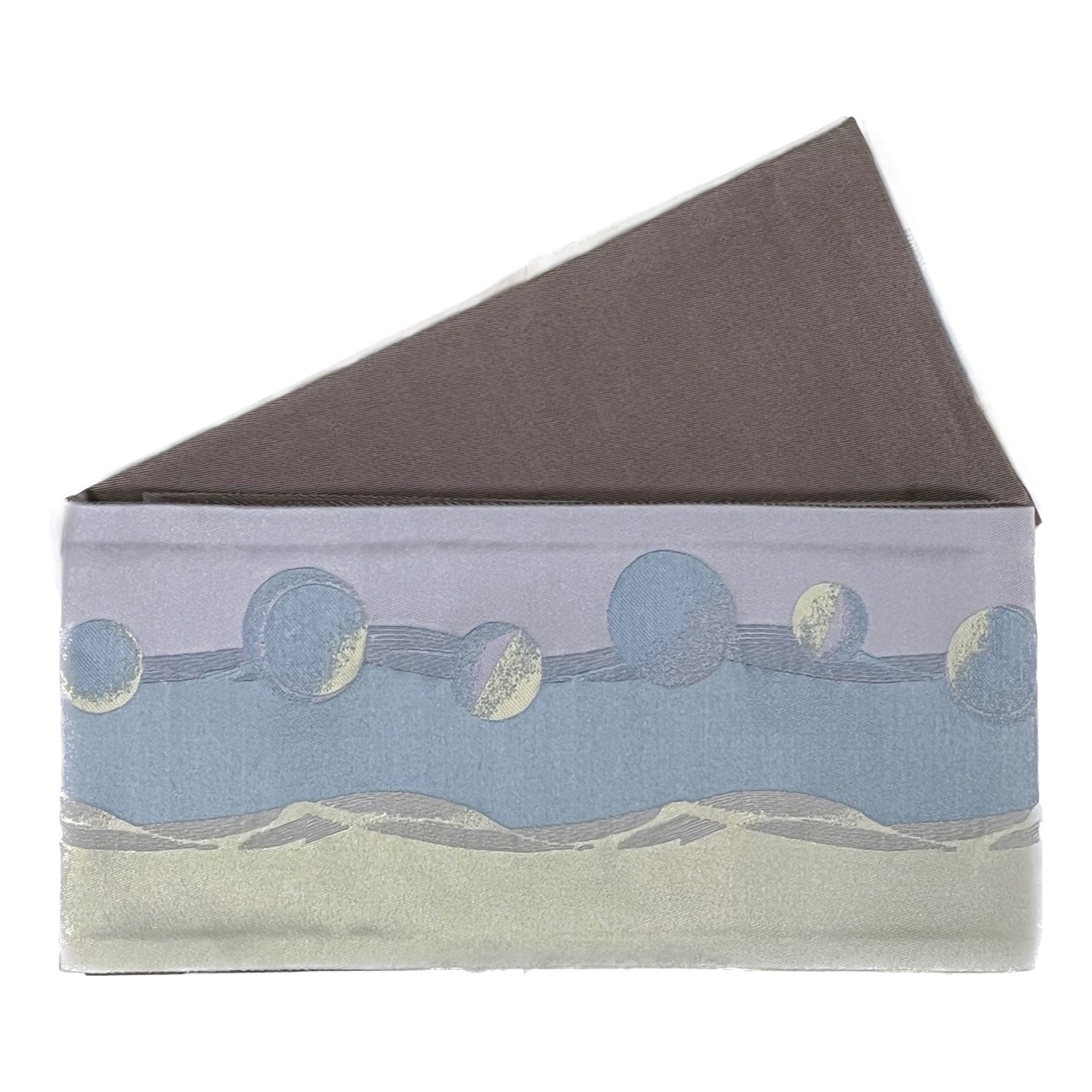 色柄説明:淡いラベンダーパープル、空色、節分草色(淡い黄緑色)の砂丘の様な抽象模様に月の満ち欠け柄がデザインされた綺麗めモダンな半幅帯です☺︎