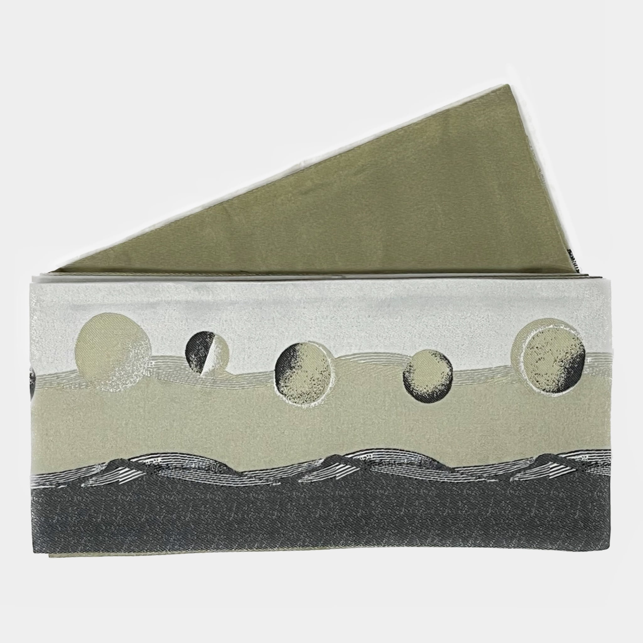 砂丘の様な抽象模様に月の満ち欠け柄がデザインされた綺麗めモダンな半幅帯です☺︎