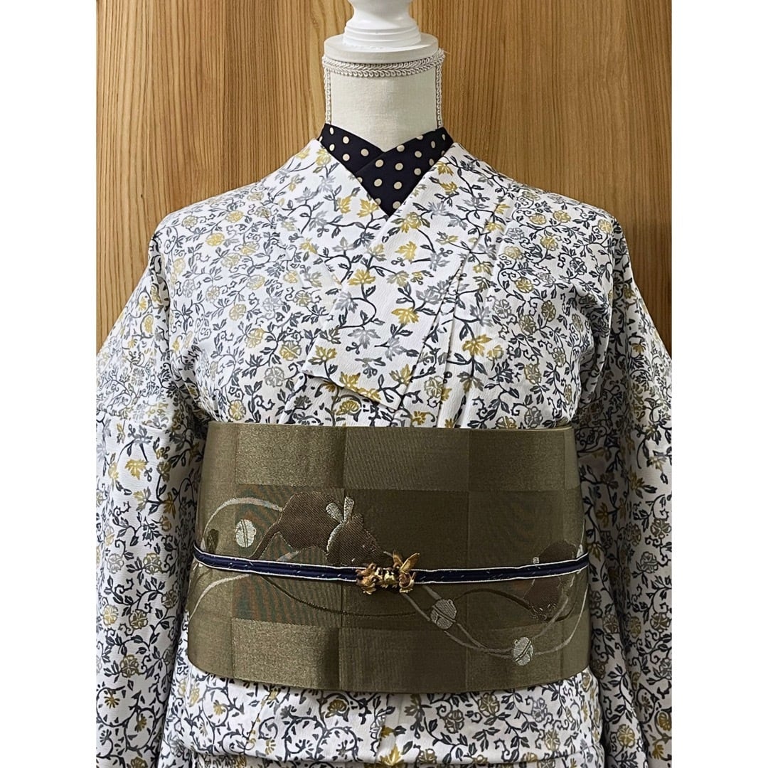 ・商品名:「ミルクホワイトカラーに型染め風唐花模様の洗える単衣小紋着物」