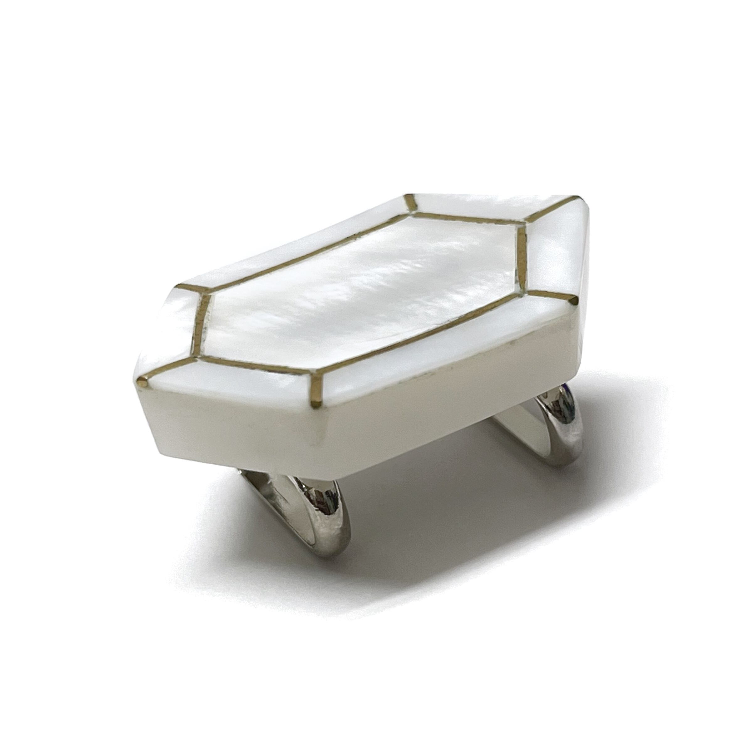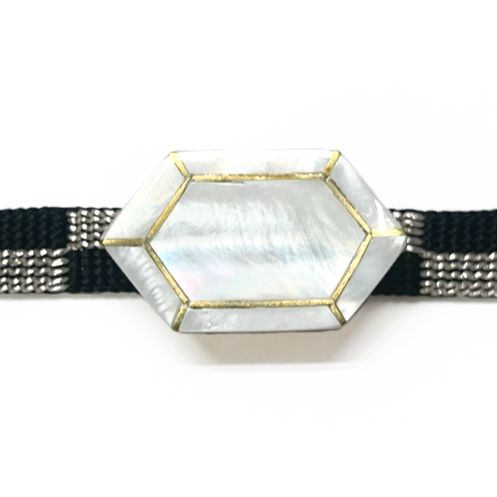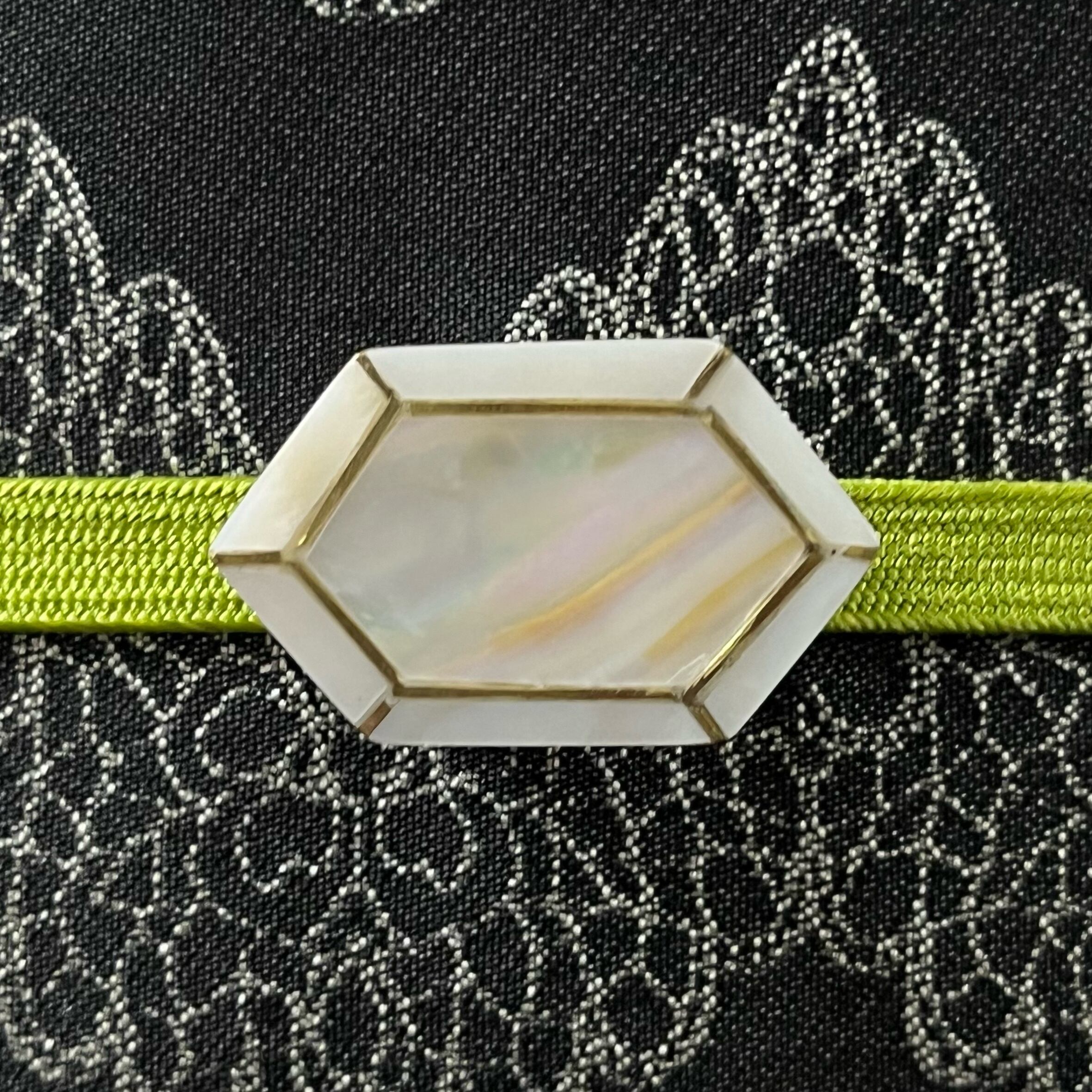 色・質感:向きによって虹色に輝く、乳白色の天然貝に金彩を施した煌めく宝石モチーフな帯留めです☺︎