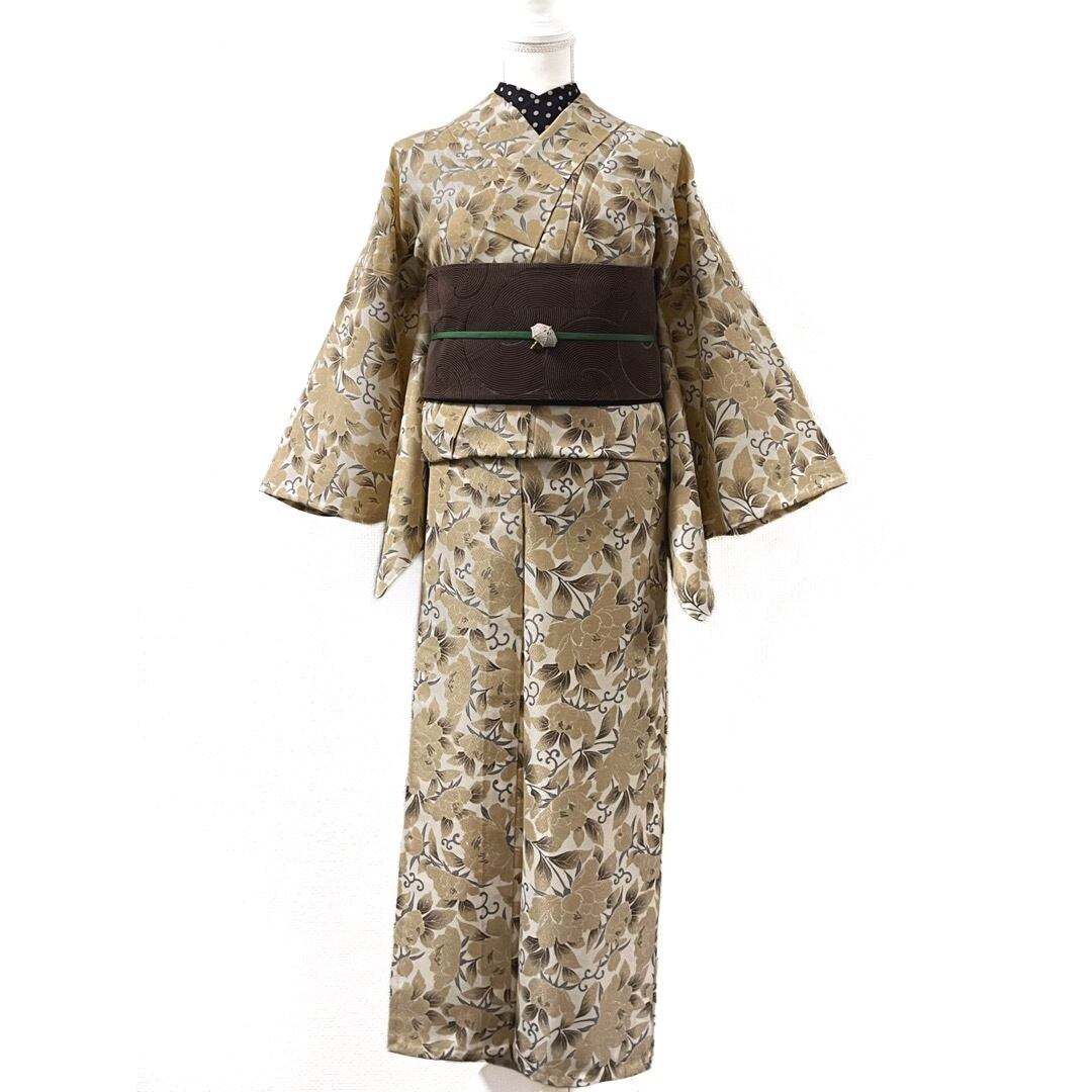 ・商品名:「ミルクティーベージュな牡丹唐草紋様の洗える単衣小紋着物」