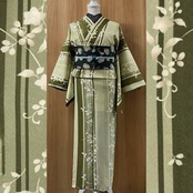 ・商品名:「薄緑色のランダムストライプに草花模様の洗える単衣小紋着物」