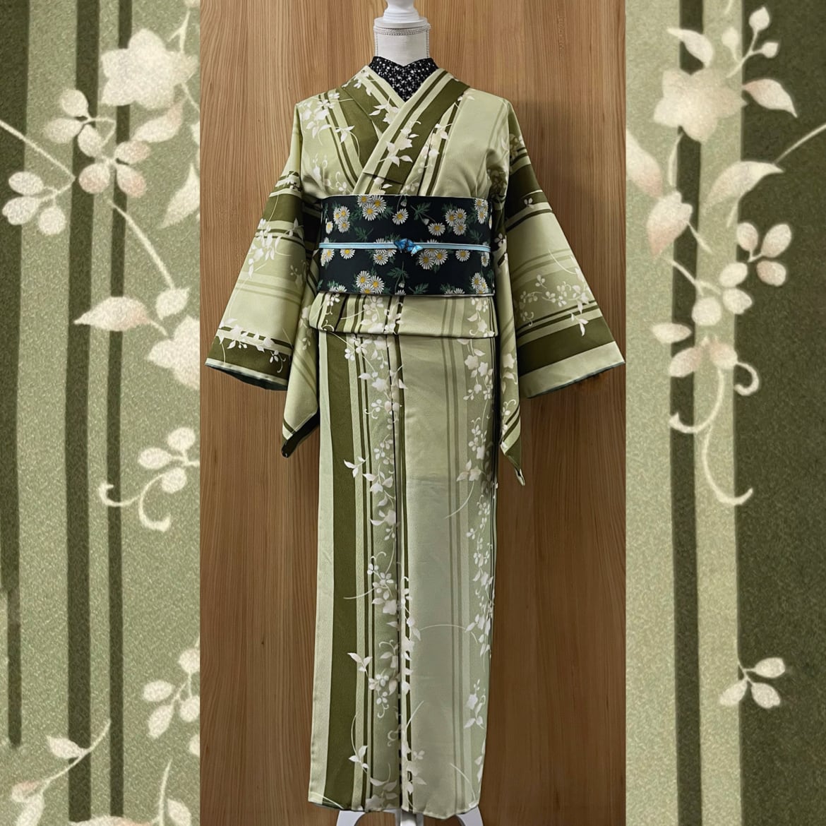 【新品】薄緑色のランダムストライプに草花模様の洗える小紋着物