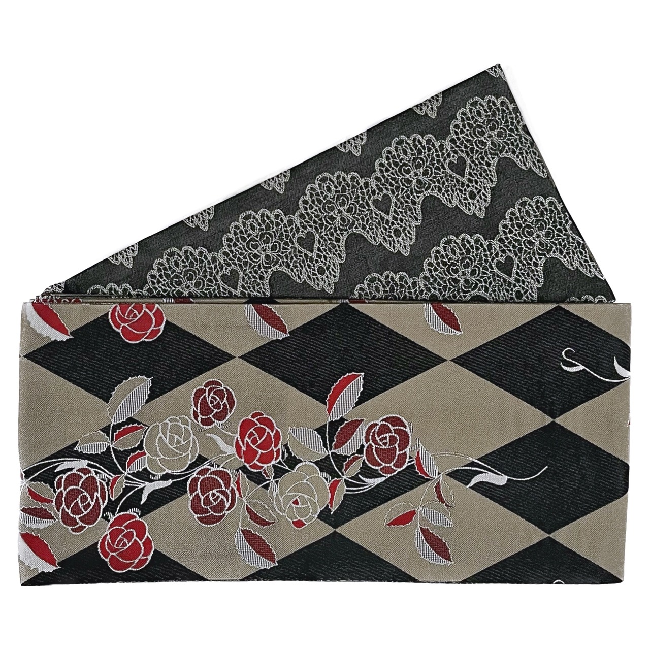 【新品】おりびと ダイヤに薔薇模様リバーシブル半幅帯(グレージュ)