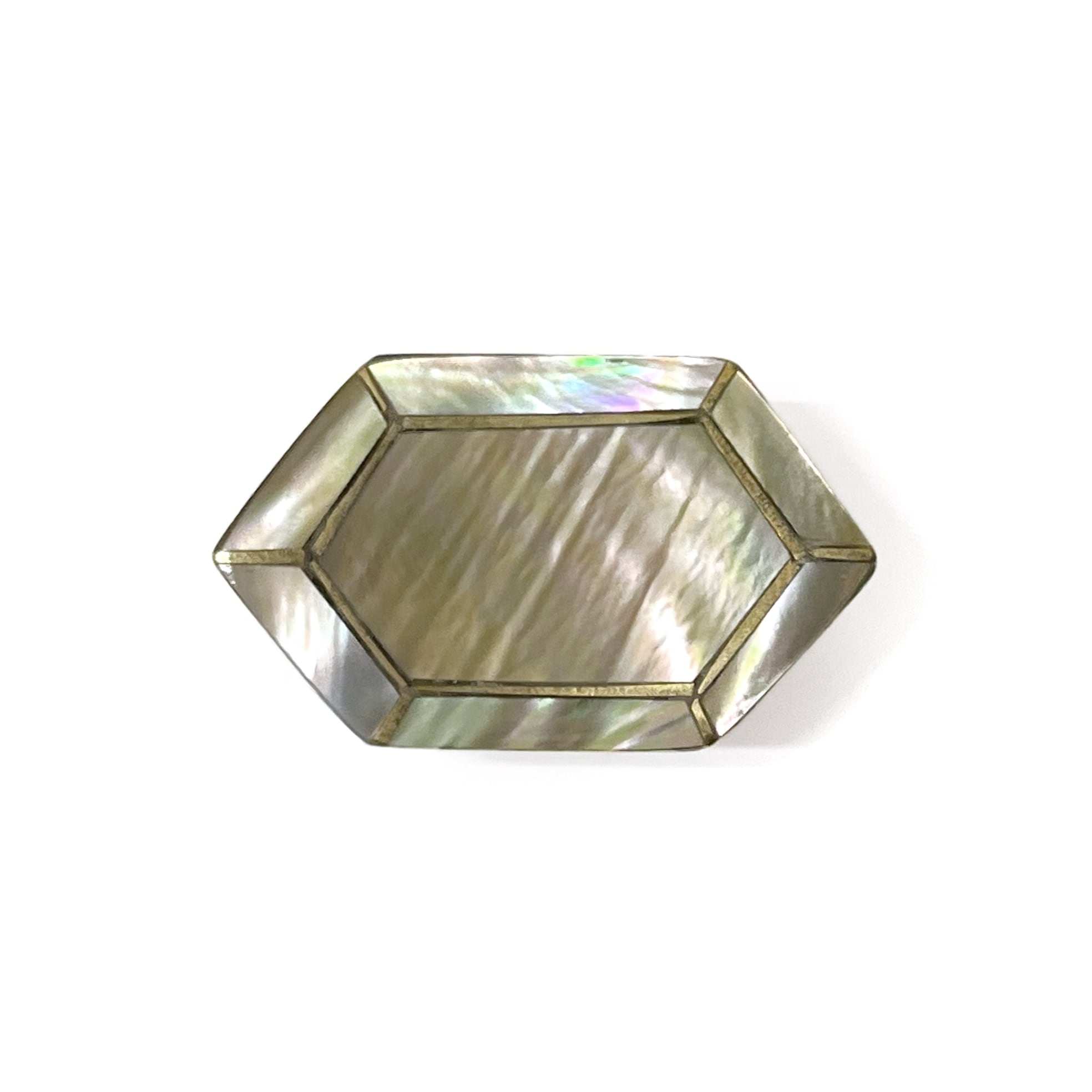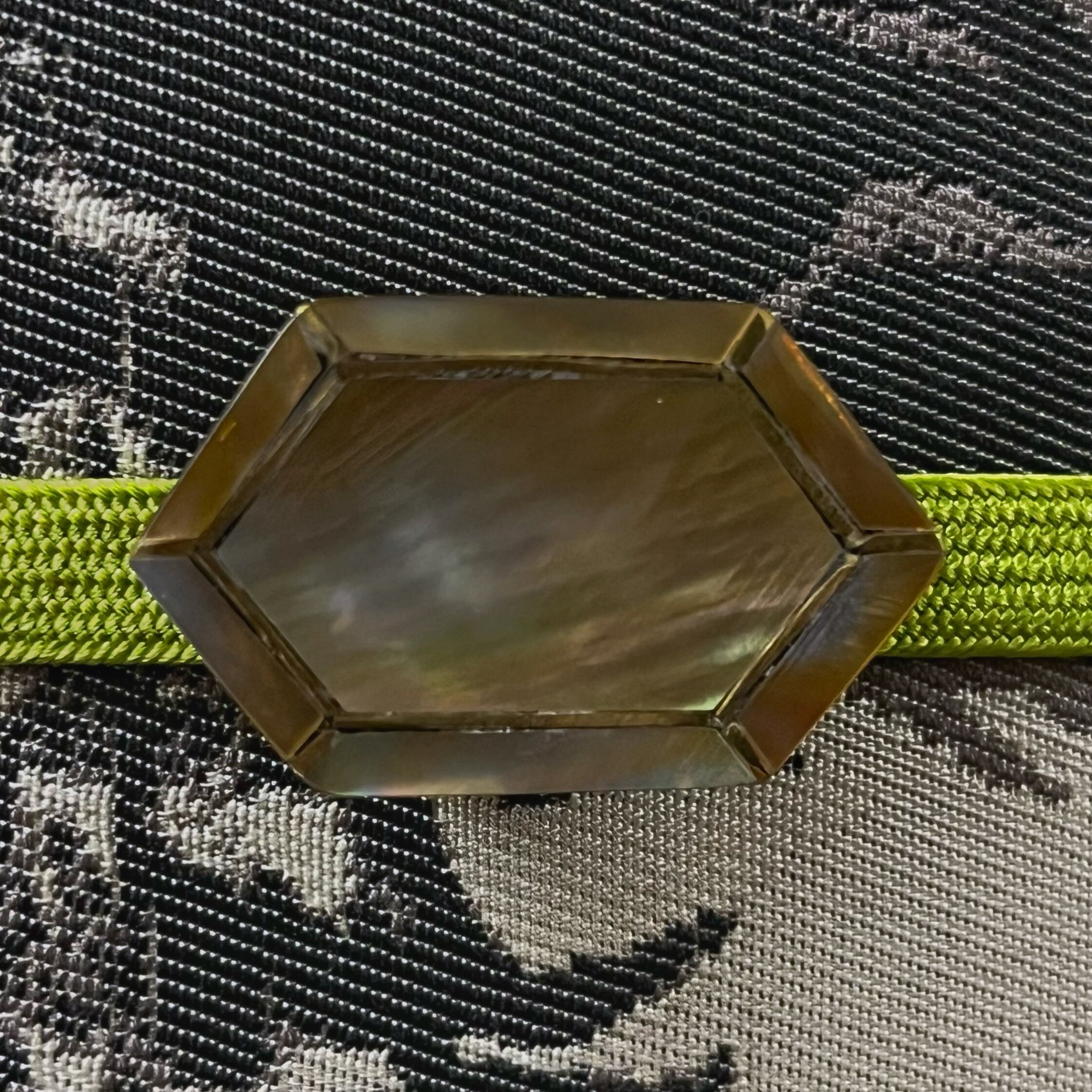 色・質感:向きによって虹色に輝く、飴色(やわらかい赤みの黃)の天然貝に金彩を施した煌めく宝石モチーフな帯留めです☺︎